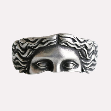 Inspirado en Afrodita, la diosa griega del amor, la belleza y el deseo, este anillo captura la esencia divina del atractivo y el encanto. Su diseño esculpido presenta cabellos ondulantes y ojos serenos, evocando la gracia eterna de la diosa y su poder de hechizar a quienes la contemplan.