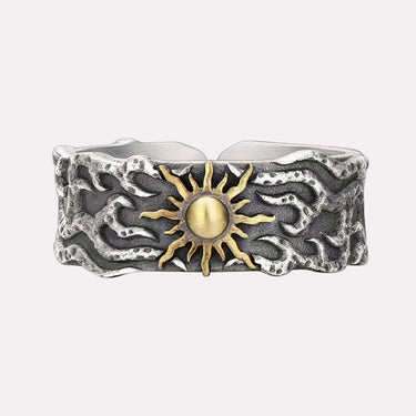 Inspirado en Helios, el dios griego que conducía su carro dorado por el cielo, este anillo meticulosamente elaborado captura el brillo y el poder del sol eterno. En su centro resplandece un sol dorado radiante, sobre una banda rugosa que evoca la energía ardiente de sus rayos extendiéndose hacia fuera.